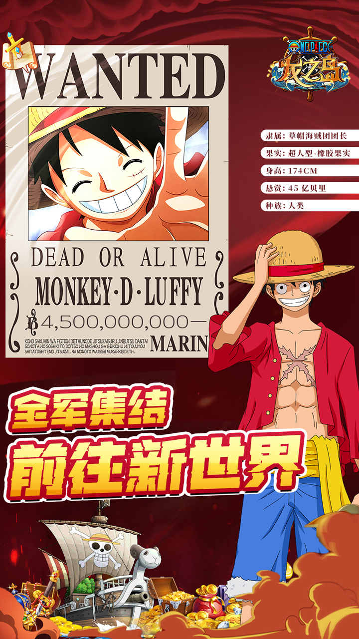 龙之岛手游是一款由东映动画正版ip授权的航海王题材手游。游戏以经典日漫海贼王改编,还原了原作中路飞、索隆、香吉士等各位经典角色和原作剧情,玩家可以在游戏中细细品味原作剧情的刺激与热血! 1、创角送:四皇路飞*1,VIP10,钻石*20W,金币*200W,千抽礼包*1 2、每日领取648代金劵 3、每日活跃礼包送大量钻石 4、连续登陆送千抽福利 5、顶级推图阵容登陆送