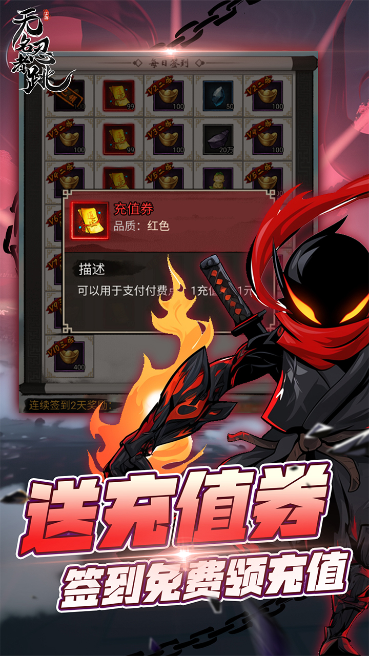 《无名忍者跳》是一款逍遥轻松的武侠放置格斗游戏,简明易懂操作体验,打破传统硬派动作武侠的刀光剑影,风风雨雨江湖武林;这里有数十个被动技能,十二个主动技能,打怪之前随心搭配!二十多个关卡技能,关卡之中随心猎取强化,一刀会心秒怪,一键贯穿清屏,或是剑气绕身、死而复生、刀枪不入,全部不在话下!上百种酷炫装备,打怪就掉放置更能掉,随心获取随意搭配。一樽酒,一把剑,悠哉御剑江湖载酒行,江湖邋遢不知名,你又将谱写一段怎样的侠客人生,让你能够邂逅全新的江湖奇遇,体验多元的江湖人生。 1.【折扣福利】全场0.05折充值返代金券,上线登临武侠之巅! 2.【惬意成长】每日任务一键速达,海量元宝轻松领,尽享极致游戏乐趣! 3.【超值投资】海量养成资源特惠礼包,超值回馈畅享游戏乐趣! 4.【限时探索】限时挑战解锁绝世秘籍,平民玩家首选,助你开局称霸! 5.【演武对决】与各路武侠高手激情互砍切磋! 返利金额仅限单日累积,不能多日累积! 注:返利货币为元宝 返利发放方式:自动返利(邮件) 返利申请是否需要角色id:是 月卡是否算VIP经验:是 月卡是否算首充:是 【充值月卡、终身卡、礼包、基金】是否计入返利:是 折前单日1000-9999元返10%元宝 折前单日10000-99999元返30%元宝 折前单日100000以上返50%元宝 备注 1、当日累积充值达到额度即可返利!只限一日累积,不能多日累积; 2、返利次日0点邮件自动发放元宝返利,玩家无需申请; 3、返利=充值金额*充值基础比例*对应充值档位的百分比。 VIP等级 充值金额(折后) VIP1 0.1元 VIP2 0.5元 VIP3 1元 VIP4 2元 VIP5 4元 VIP6 8元 VIP7 20元 VIP8 50元 VIP9 100元 VIP10 200元 VIP11 500元 VIP12 800元 VIP13 1000元 VIP14 1500元 VIP15 3000元 VIP16 6000元 VIP17 8000元 VIP18 10000元 VIP19 15000元 VIP20 20000元