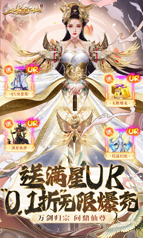 《上古修仙0.1》是一款以收集养成各类神将,渡劫修仙百变外观,超爽3D打击感的RPG修仙类H5游戏,突破了传统仙侠的宠物模式,你可以在骑乘酷炫坐骑遨游三界的同时,收服上百个神将统统纳为己用。任意搭配最强的出战神将组合,配合神级灵将变身,天上地下,唯你独尊! ★真0.1折,无物价上涨,福利送不停!开局天龙,再送648 ★在线送免费SSR猫妖。魔神降世,活跃送满星UR伙伴 ★打怪天天掉千元充值卡、各种极品幻化(充值卡每天3000元 寻妖2000 boss1000,幻化一堆 各种的 后面会掉更高品质的) ★全新开箱子玩法,不一样的体验 ★任务送全套UR幻化套装 ★登录送超值豪礼(第一天送500仙玉,第二天送限定时装,第三天送UR杨戬绝版守护,第四天送五十抽,第五天送限定UR坐骑,第六天送1000仙玉,第七天送UR小龙女绝版伙伴)