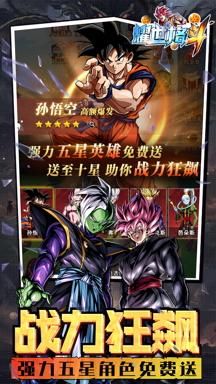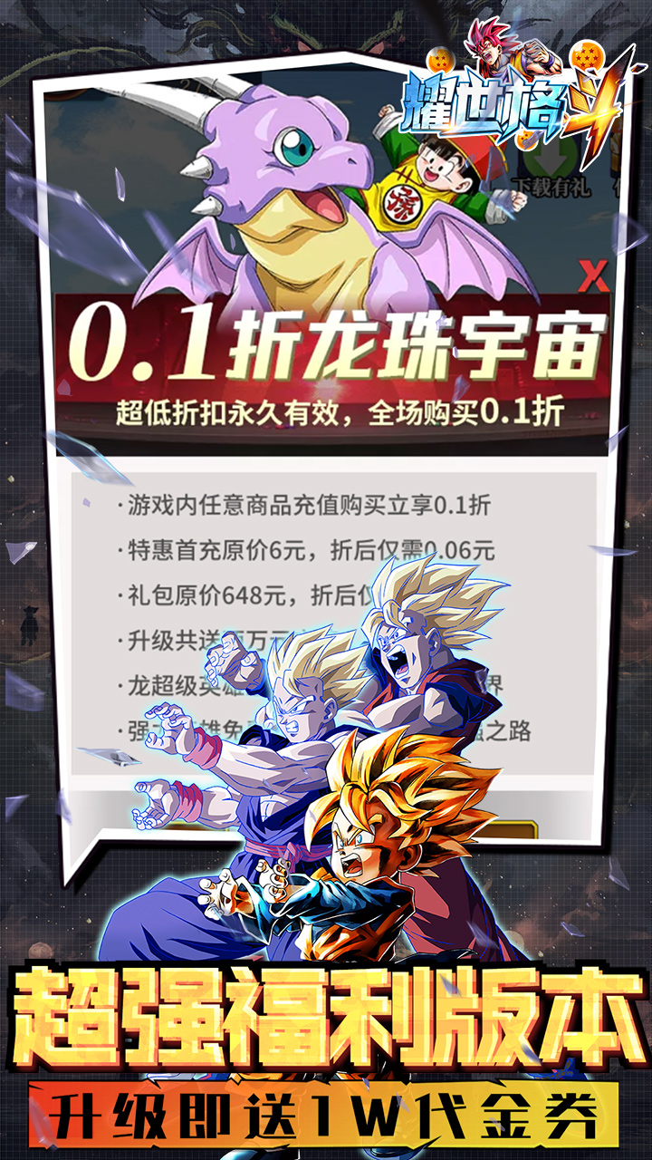 耀世格斗是一款龙珠IP挂机卡牌游戏,可获取并使用龙珠IP里的大部分经典人物。 除了最经典的龙珠与龙珠Z的人物外,游戏还汇集了龙珠GT、龙珠超、龙珠超级英雄等其他世界观里的龙珠人物。 在游戏中,玩家将扮演一位在龙珠世界里游历的小队长,收集并培养自己喜欢的英雄队伍,体验最经典的龙珠激斗, 并在挂机模式下自动战斗,享受轻松的游戏乐趣。 1.全场充值仅需0.1折 所有充值项0.1折,原价648现仅需6.48即可购买。首次购买9900代金券更可享50%超值返利。 2.五星角色免费送 推进游戏进度、完成活动任务即可免费获得大量五星角色。完成全部任务每位角色最少可获4名,并赠送大量随机五星角色。 3.升级就送万元充值卡 提升等级就可获赠大量充值卡,累计最高可获一万充值卡。无需充值即可获得大量钻石、VIP经验,轻松提升VIP等级。 4.海量日常奖励 完成每日、每周任务可获得大量资源奖励,更有不间断签到活动赠送福利。 5.免费千抽福利 完成每期挑战任务,获得免费抽卡次数。累计最高可获得1500抽。 6.多样开服活动 新服开启同步上线多种限时活动。每日登录、完成活动挑战均可获得大量奖励。 7.天天送648代金券 8.百倍返利 小投资大回报 VIP等级 累计充值(折前) VIP1 6元 VIP2 30元 VIP3 100元 VIP4 300元 VIP5 500元 VIP6 1000元 VIP7 2000元 VIP8 4000元 VIP9 10000元 VIP10 20000元 VIP11 40000元 VIP12 60000元 VIP13 100000元 VIP14 150000元 VIP15 200000元 VIP16 300000元 VIP17 400000元 VIP18 500000元