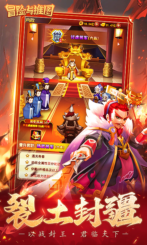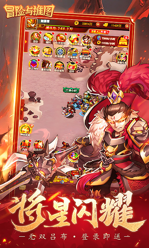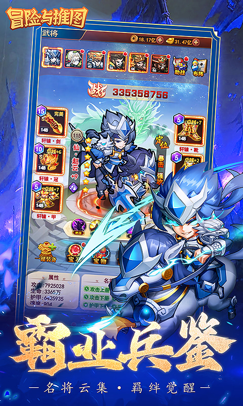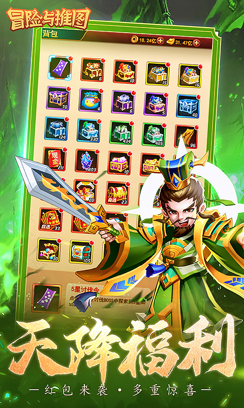 【游戏简介】 《冒险与推图》是一款深度三国的放置卡牌手游。梦回三国,扮演一位白手起家的主公,率领招募的武将,排兵布阵,攻城掠地,横扫四方,与各路好强一决高下,一步步拓展霸业,倾覆天下! 福利一:物价不膨胀,全场原价0.1折来袭! 福利二:登录即享创角奖励,【7品 - 张辽】强势来袭,零氪玩家的福音! 福利三:超值首充礼包仅需0.06元,解锁【5星 - 百胜套装】,开启三国争霸之旅! 福利四:百抽保底,武将、装备、神器一网打尽!更有机会抽取绝世神将,一统天下,成就霸业! 福利五:解锁多样玩法,尽享三国盛宴!超过8种PVE挑战与6种PVP对决,指尖三国,纵横天下! 福利六:更多特惠礼包和福利活动不定期更新,惊喜不断,战斗不息,让我们一起逐鹿中原! 现金点=1:1 元宝=1: 10