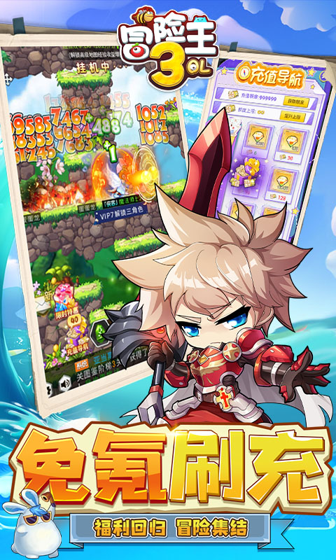 冒险王手游《冒险王3OL(金币爆给免氪服)》2024/6/6 8:00首发 《冒险王3OL(金币爆给免氪服)》是冒险王手游系列的又一新品,传承了冒险王系列手游的经典玩法和美术风格。上线就送免费充值工具,直接免费激活首充,还能激活所有福利卡拿海量资源,每日累充,七日累充、长期累充全部激活,天天福利每天0.1折购买福利卡,拿海量金币且激活游戏内大量累充活动,拿极品奖励!每天登录活跃就可领取海量充值卡!百万充值卡上亿彩钻等你来拿!充值卡直接激活贵族VIP!神级还原了吸怪的经典玩法,Q萌Boss满身神装等你爆,还有数千种时尚搭配。神秘的未知大陆,Q萌的冒险世界,快来和小伙伴们一起找回最初的快乐吧! 1.上线就送免费充值工具,直接免费激活首充,拿海量充值福利和彩钻,还能激活所有福利卡拿海量资源,每日累充,七日累充、长期累充全部激活,极品道具还有各种福利领不停! 2.天天福利每天0.1折购买福利卡,拿海量金币且激活游戏内大量累充活动,拿极品奖励! 3.每天登录活跃就可领取海量充值卡!百万充值卡上亿彩钻等你来拿!充值卡直接激活贵族VIP!拿极品道具通关BOSS毫无压力! 4.游戏内还送内置外挂,轻松解放双手,各种BOSS自动挑战,轻轻松松不肝不氪!充值比例1:1000 5.初始赠送贵族7,VIP完成任务全部免费领取!